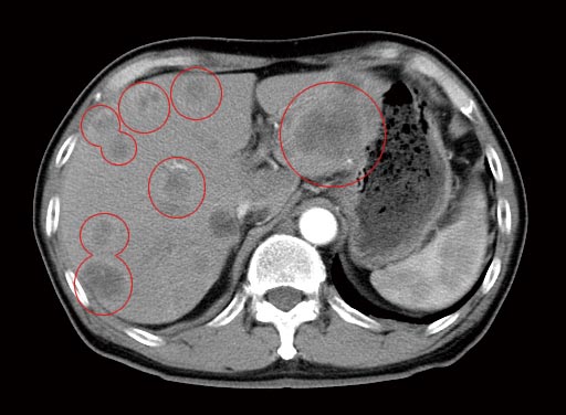 治療前CTでは、肝臓全域に広がる多数の肝転移病巣が認められました。