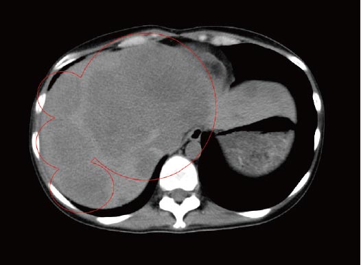 来院時のCT(下の画像)では肝臓の右葉に大きく広がる肝転移病巣が認められました。両像所見から勘案すると、正常に機能している肝臓部分は20%以下と推測され、肝不全による病状の急変も非常に懸念される症例でした。