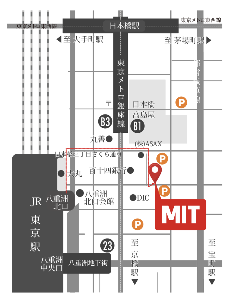 首都高速道路の「宝町 IC」出口から八重洲通り右折。京橋一丁目交差点を右折して昭和通り進みます。左手にあるファミリーマートが見えたらさくら通りを左折して、最初の交差点を左折して八重洲北口通りを進むと右手に見える白いビルが日本橋ビルです。