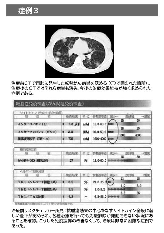 即座にリスクチェッカー検査を実施しました。それにより抗がん性サイトカインに著しい減少(免疫疲弊)を認め、抗がん性免疫が応答していない状況を確認しました。