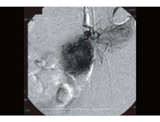 下の画像は、治療前に血管カテーテルによって大腸がんそのものを調査した画像です。がん細胞の回りを取り囲むがんの新生血管が良く観察できます(丸く、黒々と染まった部分)。この時点での残り余命判断は非常に厳しいものでした。およそ1ヶ月程度。それも大きな急変が無ければ、が条件です。即時入院、そして生存して病院を退院することが想定されない末期的状況と言える状態でした。