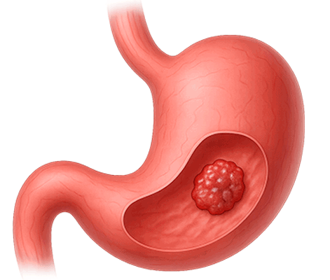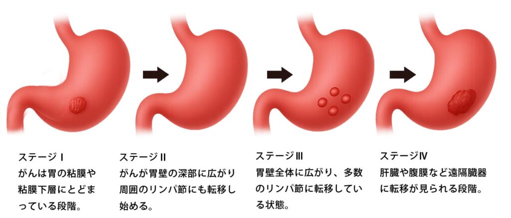 初期(ステージ0〜I):胃の粘膜内に限局/進行(ステージII〜III):胃壁の深部や周囲リンパ節へ浸潤/転移(ステージIV):肝臓・腹膜・肺など遠隔臓器へ拡がる