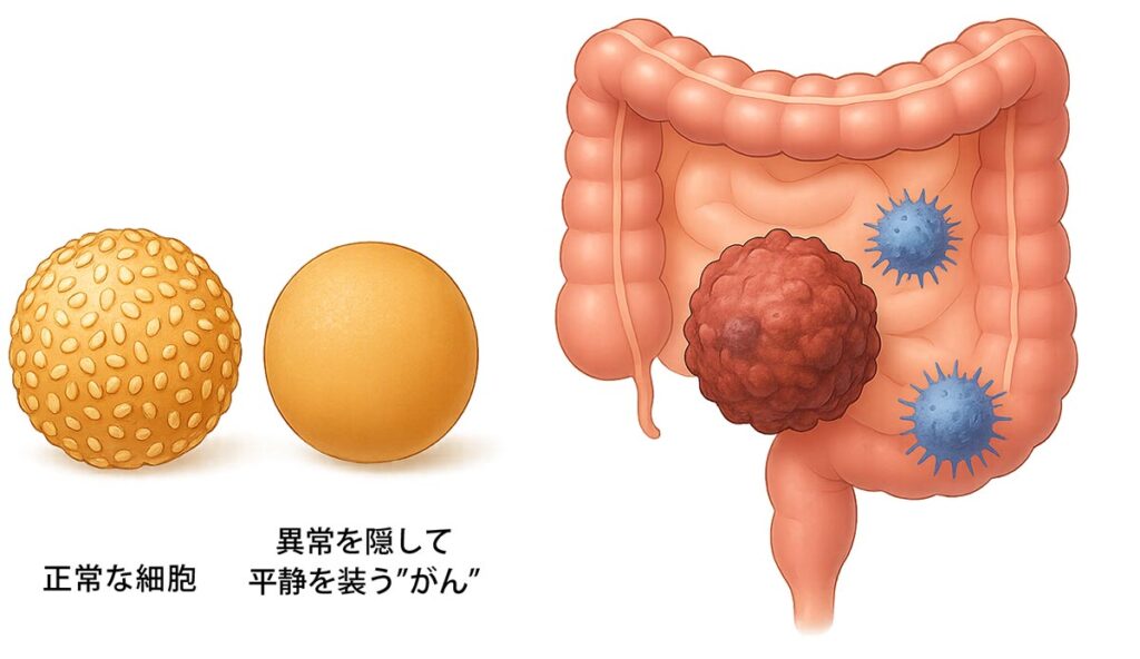 もう一つの特徴は、がん細胞は免疫の目から異常を隠し平静を装う性質を持つ(再発・転移)ことです。本来であれば、免疫細胞は「異常な細胞」を見つけ出し、体から排除しようと働きます。しかし、がん細胞は巧妙に自分の姿を偽装し、免疫に気づかれないようにしてしまうのです。