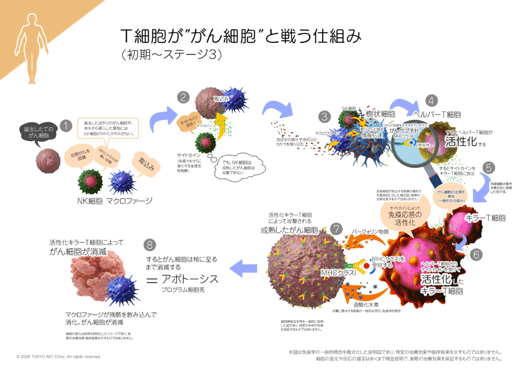 本ページは、がん免疫の仕組みや、現在研究・実践されている治療アプローチについて、医学的な情報提供を目的としています。特定の治療効果や結果を保証するものではなく、治療の適応や判断は、医師による個別の診察が必要となります。