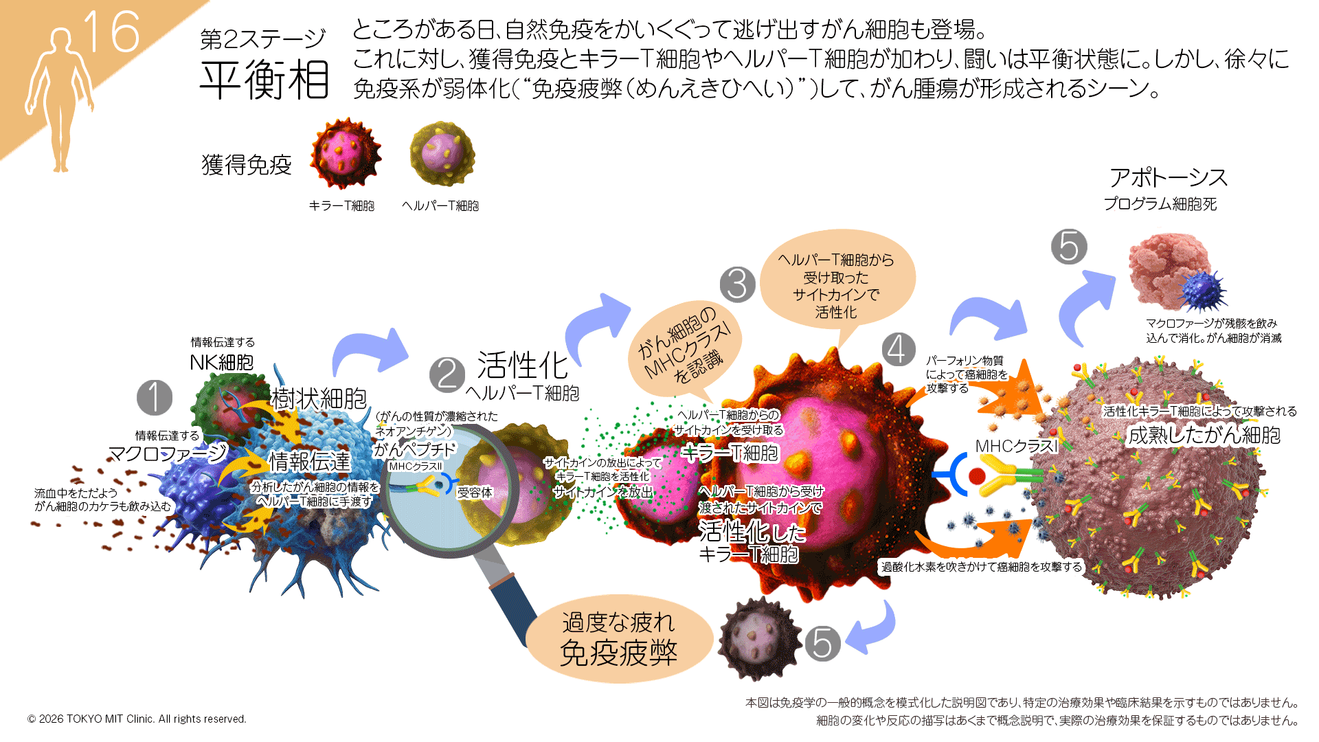 第一防衛線を突破した手強いがん細胞に対し、いよいよ獲得免疫の主役である「キラーT細胞」が出動します。ここから、がん細胞と免疫の本格的な攻防戦が始まります。破壊されるがん細胞と、それを巧みにかわし生き延びるがん細胞が入り混じる、一進一退の均衡状態です。