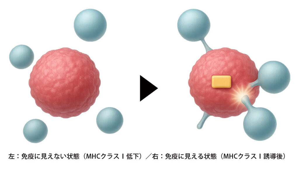 進行・再発・転移といった“免疫の目を逃れたがん”に対して、MHCクラスⅠ分子の発現を促し、再び免疫細胞に認識させる治療です。