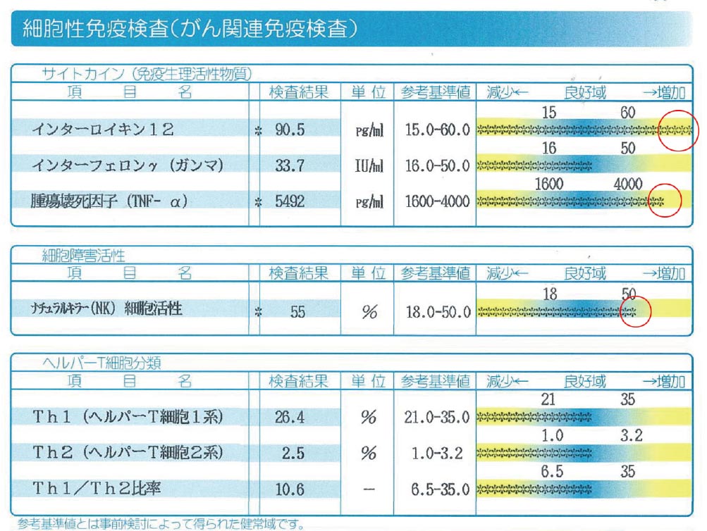 がん免疫の状況を詳細に調べるため、がん高度精密血液検査システム「リスクチェッカー」が即座に実施され、抗がん性サイトカインの著しい上昇(リンパ球失調)と、転移がんに対抗すべく上昇したNK細胞活性値を確認しました。