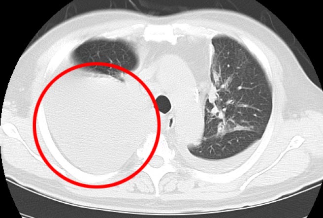 治療前CTでは右肺に大量貯留した胸水が認められました。