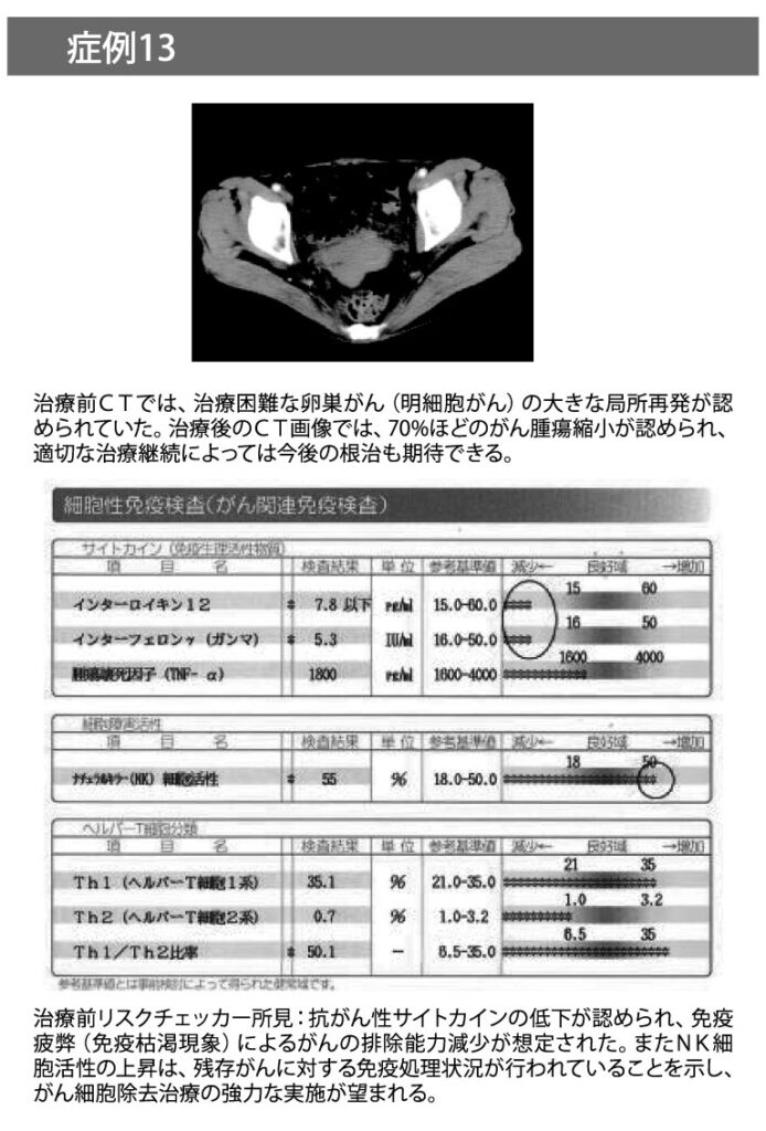 各種治療に抵抗性のある明細胞がんというタイプの卵巣がんでしたが、治療開始2カ月程度で肉眼的な縮小が確認できるようになり、症状・腫瘍マーカーも改善。提示した6カ月経過時点のCTでも効果的縮小を保っています。経過観察中。