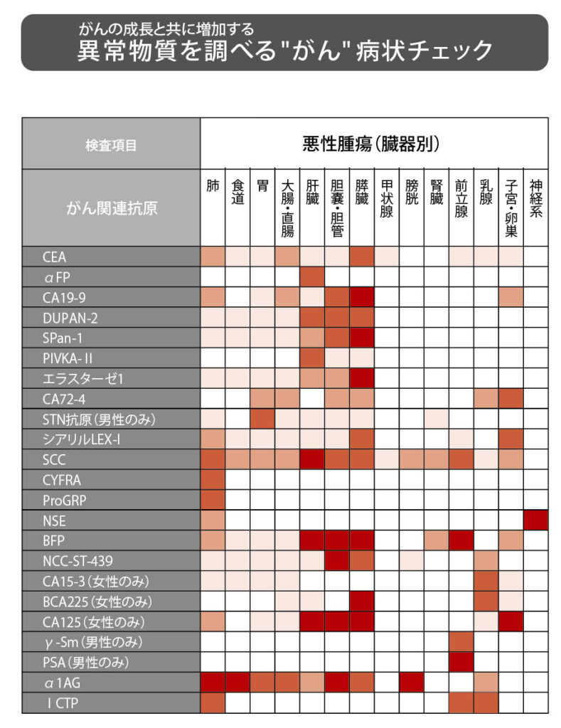 各臓器・がん種に関連性のある血中マーカーを検査。早期発見や病状評価の基礎データとなる指標を確認します。